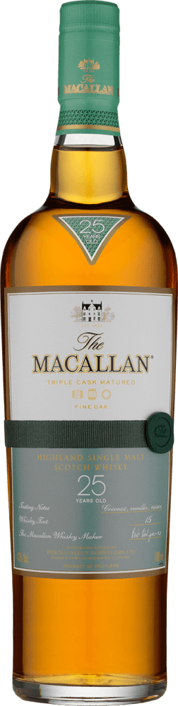The Macallan Fine Oak 25 Years Old forms part of the Fine Oak range and is matured for a minimum of twenty five years in three exceptional oak cask types. This complex combination of casks delivers a robust flavor profile with notes of vanilla, peach and sherry.