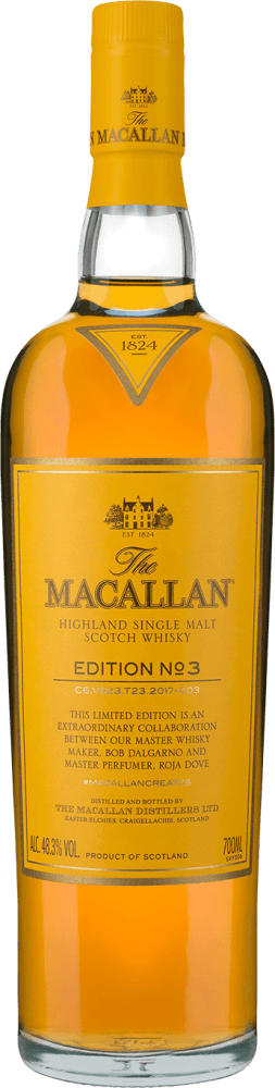 Inspiration and innovation lie at the heart of The Macallan and nowhere is this more evident than in The Edition Series. Edition No. 3 brings to life the flavor experience of The Macallan through aroma, calling on Master Perfumer Roja Dove's remarkable sensory knowledge and expert sense of smell to create the third unique expression in the series. Borne of two art forms, Edition No. 3 unites the worlds of whisky and aroma to reveal the complexities of single malt character and the power of the senses in creating and experiencing The Macallan. When we experience and enjoy whisky, the power of aroma is unquestionable - and it is this power that makes the approach to Edition No. 3 truly mesmerizing.