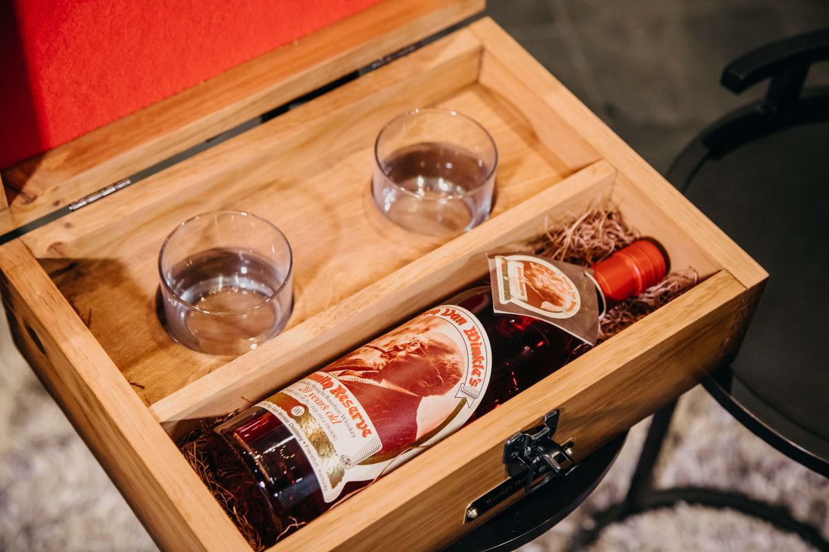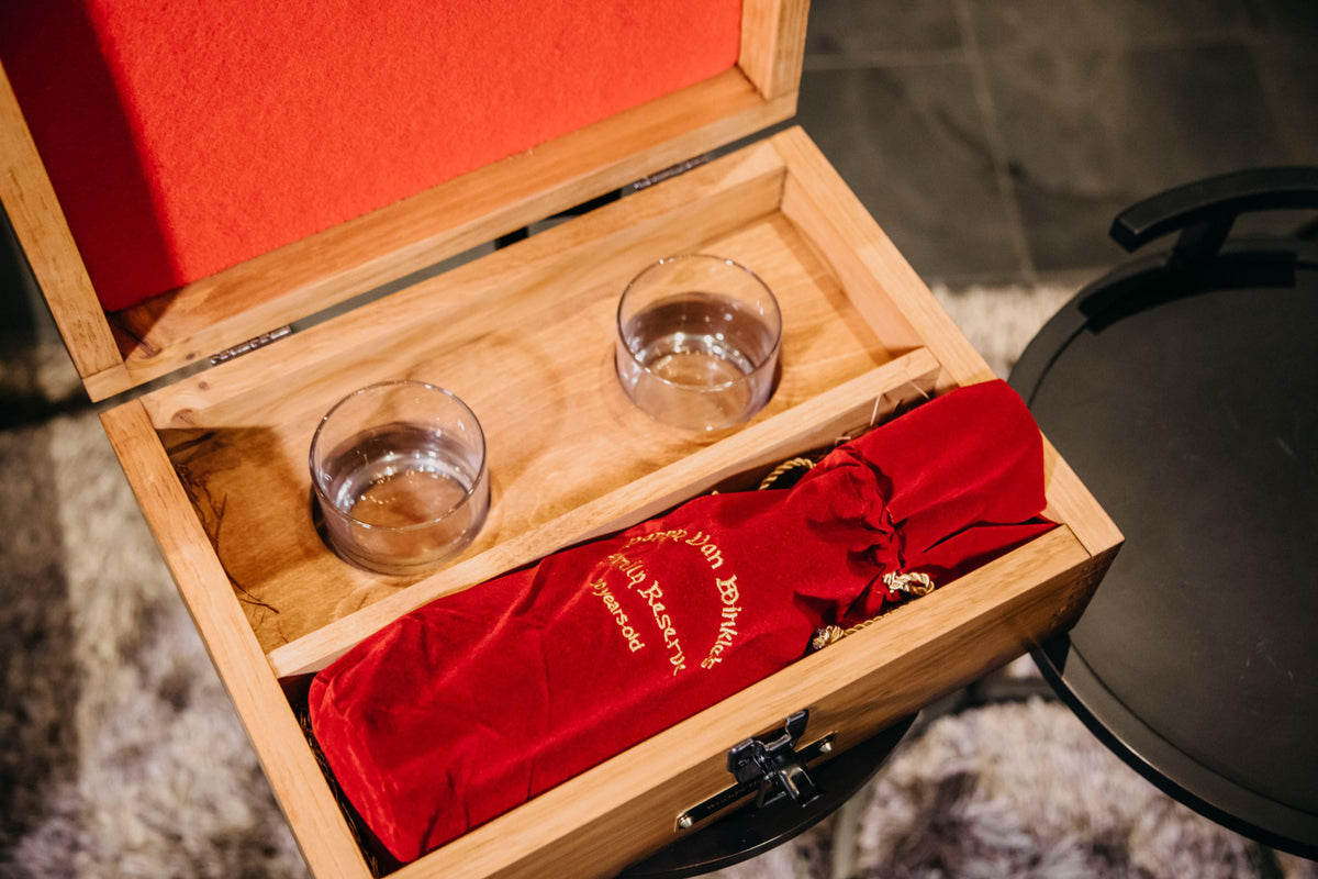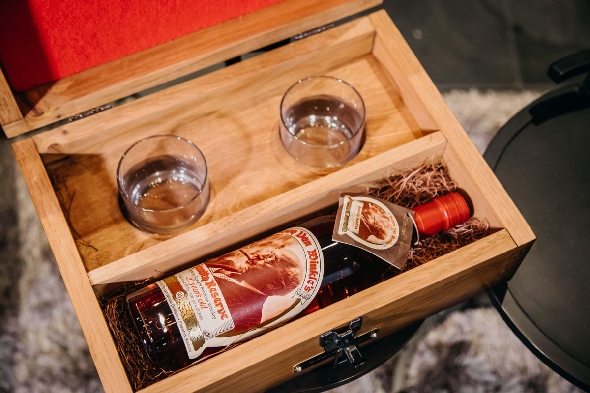 As you open the antique latch, it reveals a felt top that has been covering 2 hand-blown glasses and a bottle of Pappy Van Winkle Bourbon Aged 20 Years laying gently and securely in a batch of hypoallergenic antique packing straw. The exterior dimensions of this one of a kind gift box are 14.75″W x 10.75″D x 5.75″H. Because each box is handmade, quantities are limited and please inquire for expedited shipping.