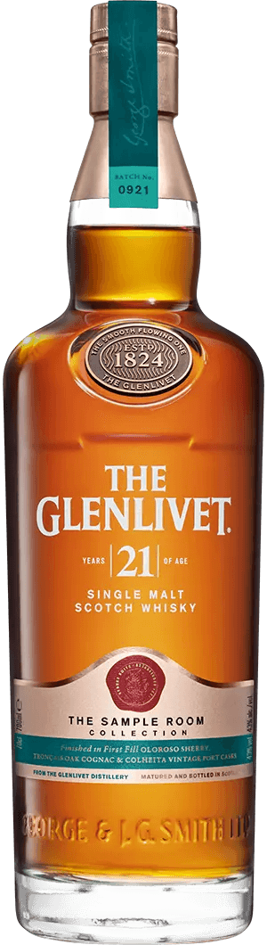 Fully finished in first-fill Oloroso sherry, Tronçais Oak Cognac and Colheita port casks, The Glenlivet 21 Year Old single malt scotch whisky brings extra layers of depth, sweetness and intriguing spiciness to The Glenlivet’s iconic smooth and fruity style.