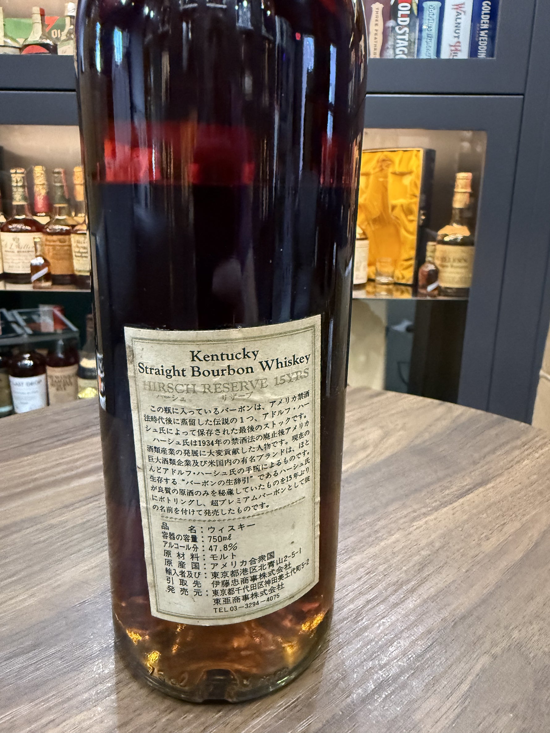 Although many variants were released under the Hirsch label —15, 16, 17, 18, 19 and 20yr-olds—the 15yr gold wax "script" variant is sought after because of its Lawrenceburg bottling location, Japanese export status and overall rarity.