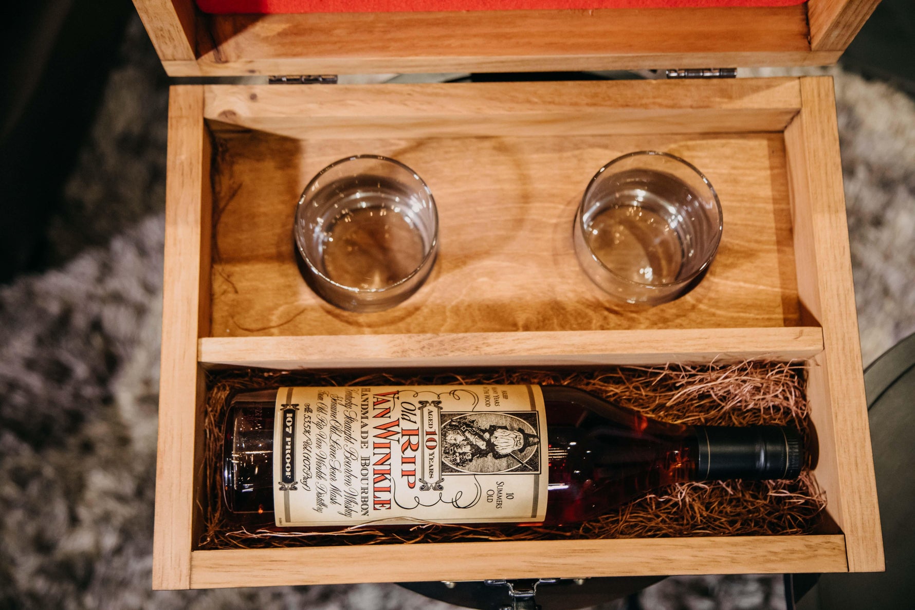 An inviting and rustic custom handcrafted wooden gift box with a brass nameplate with the engraving "Best Pappy Ever" that teases the fact that someone special is about to open something equally special. As you open the antique latch, it reveals a felt top that has been covering 2 hand-blown glasses and a bottle of Original Rip Van Winkle Bourbon Aged 10 Years laying gently and securely in a batch of hypoallergenic antique packing straw. The exterior dimensions of this one of a kind gift box are 14.75″W x 10.75″D x 5.75″H. Because each box is handmade, quantities are limited and please inquire for expedited shipping.