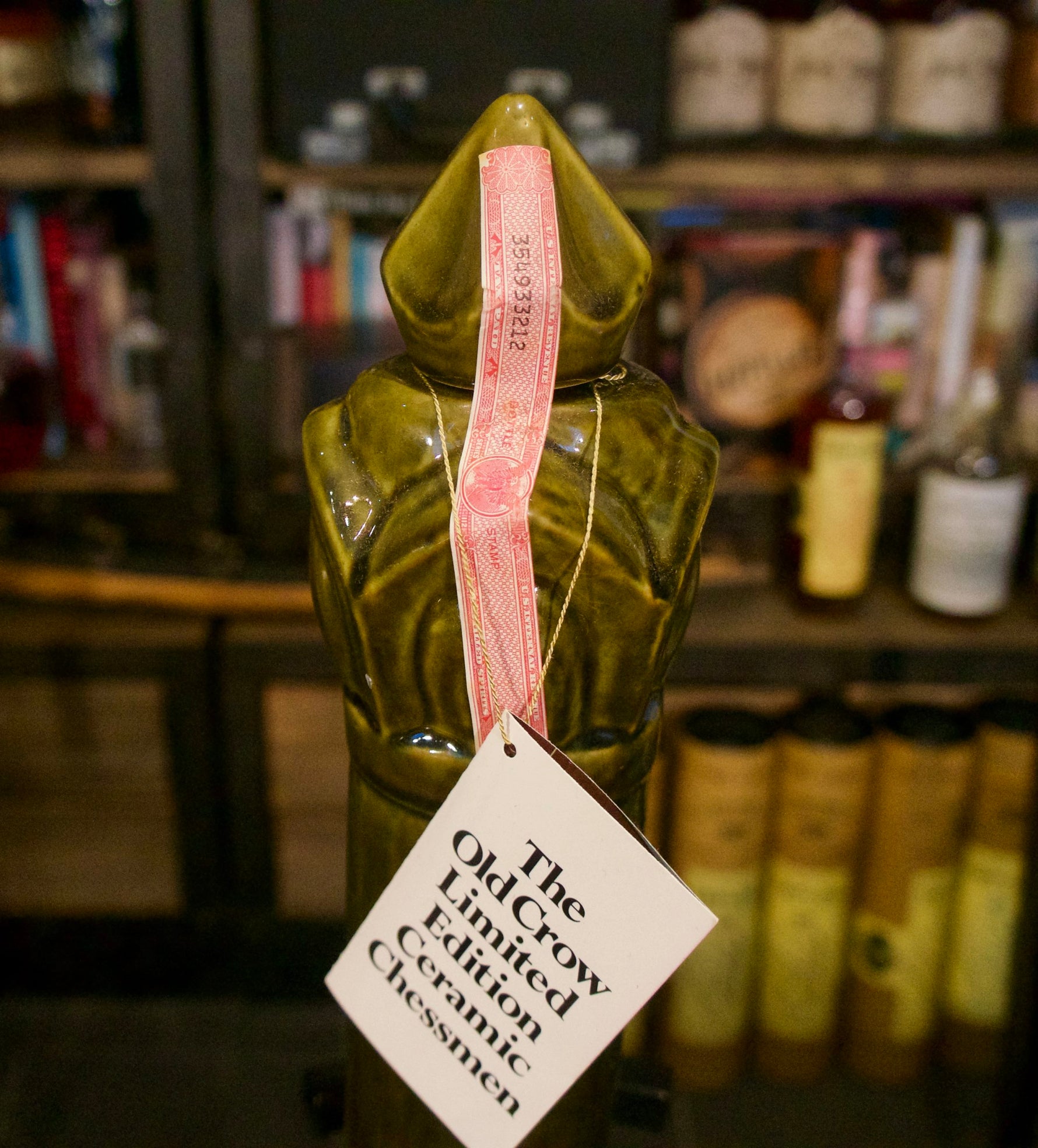 Back in the 1960s through the 80s, distilleries were having trouble selling their whiskey in bottles so they started creating unique bottlings through the use of Decanters. Old Crow, which was owned and produced by National Distillers created a full chess set of decanter bottles, complete with all pieces and the ability to send them postage to receive a carpeted chessboard as well. The whiskey inside is 86pf and age stated 10 years, but is among some of the highest rated whiskey by vintage enthusiasts that has ever been produced.