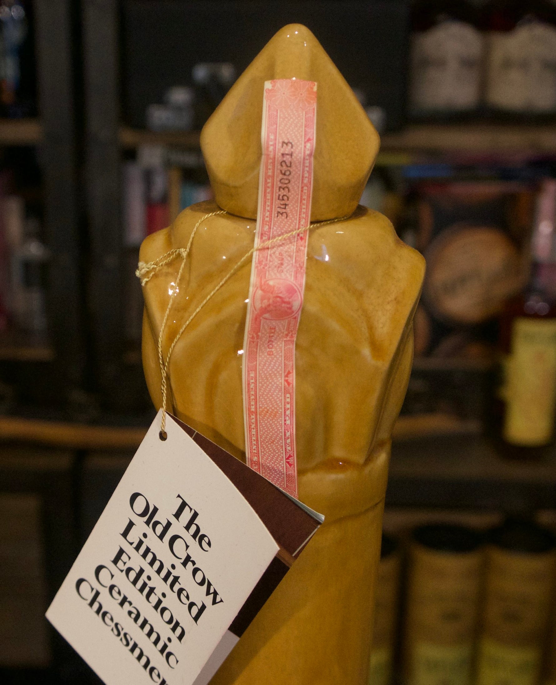 Back in the 1960s through the 80s, distilleries were having trouble selling their whiskey in bottles so they started creating unique bottlings through the use of Decanters. Old Crow, which was owned and produced by National Distillers created a full chess set of decanter bottles, complete with all pieces and the ability to send them postage to receive a carpeted chessboard as well. The whiskey inside is 86pf and age stated 10 years, but is among some of the highest rated whiskey by vintage enthusiasts that has ever been produced.