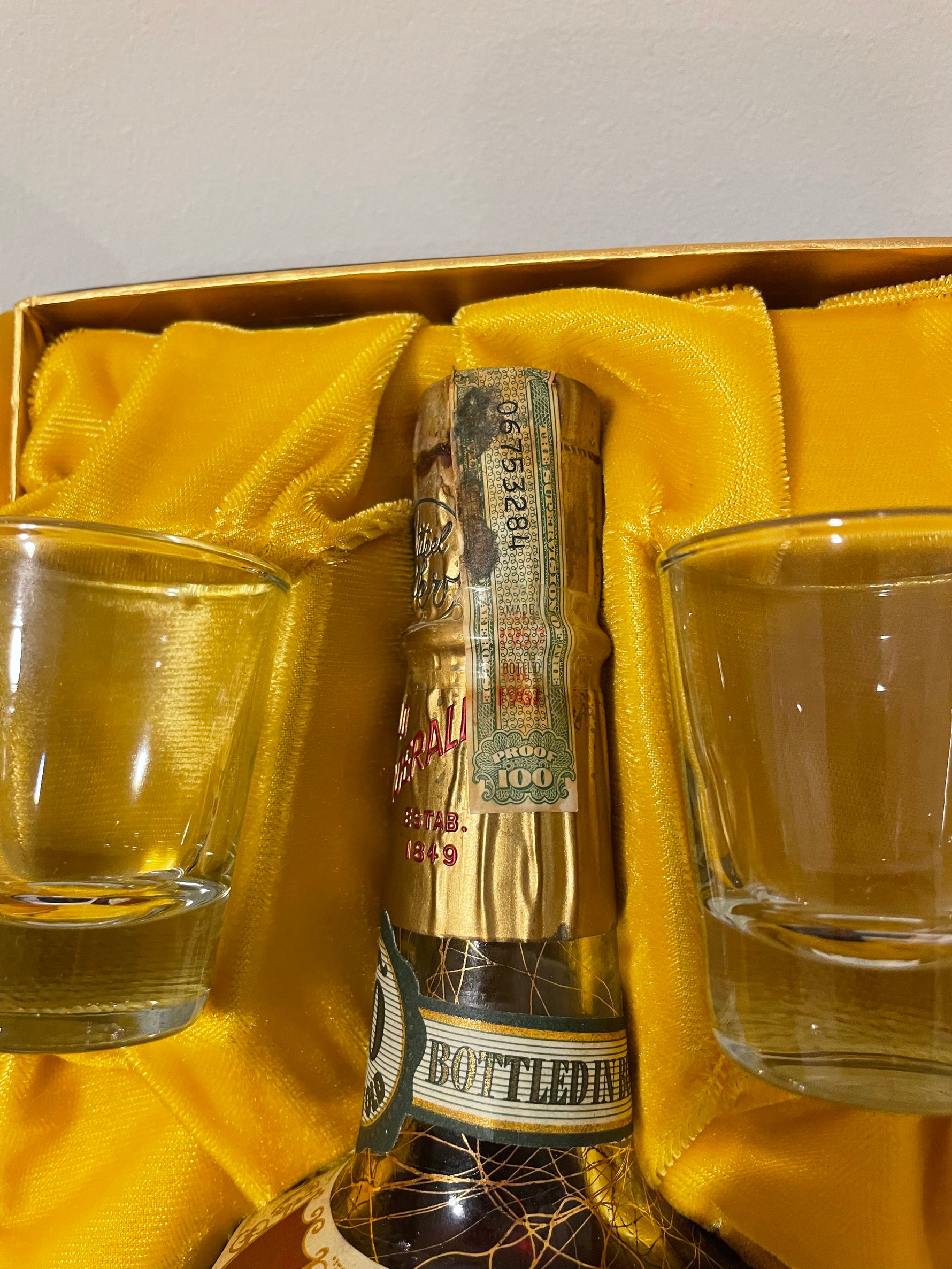 A stunning gift box and bottle distilled by Julian "Pappy" Van Winkle himself. The gift box and bottle are both in great condition with some minor discoloration on the foil. These bottles are prone to leaking due to the age of the bottle and the seals. We will pack our best to avoid and leaking however a small amount could be expected.