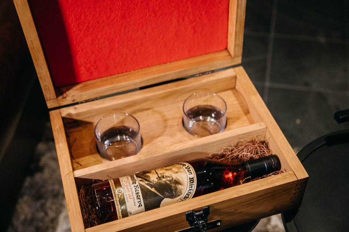 As you open the antique latch, it reveals a felt top that has been covering 2 hand-blown glasses and a bottle of 2018 Pappy Van Winkle Bourbon Aged 15 Years laying gently and securely in a batch of hypoallergenic antique packing straw. The exterior dimensions of this one of a kind gift box are 14.75″W x 10.75″D x 5.75″H. Because each box is handmade, quantities are limited and please inquire for expedited shipping.