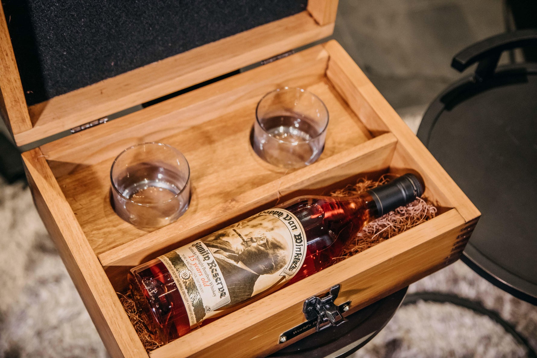 As you open the antique latch, it reveals a felt top that has been covering 2 hand-blown glasses and a bottle of 2018 Pappy Van Winkle Bourbon Aged 15 Years laying gently and securely in a batch of hypoallergenic antique packing straw. The exterior dimensions of this one of a kind gift box are 14.75″W x 10.75″D x 5.75″H. Because each box is handmade, quantities are limited and please inquire for expedited shipping.