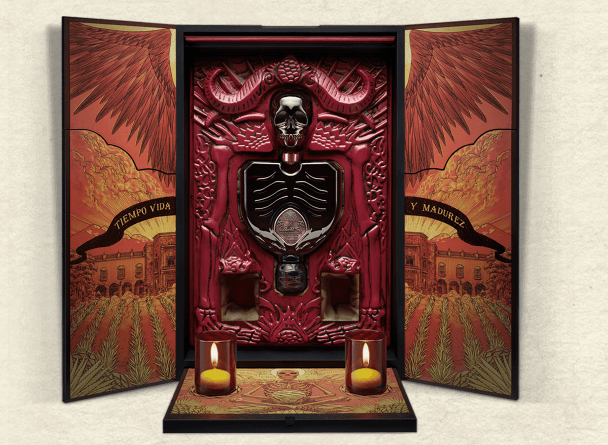 To set the mood for the tequila drinking experience, votive candles are included alongside the bottle to create an illuminated altar.